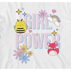 Celebrate Girl Power with this Squishmallows tee. The shirt features images of Sunny the Bee, Fifi the Fox, flowers, hearts, and a rainbow while pink letters in the background spell out, “Girl Power.” The tee comes in a white short sleeve crew neck. Fans of Squishmallows will love this comfy cotton t-shirt.