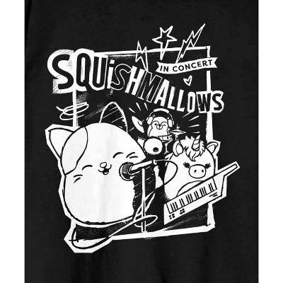 Rock out in this tee with your favorite Squishmallows. The shirt features black and white images of your favorite Squishmallows rocking out on the drums, mic, and keyboard while white and black letters read, “Squishmallows in Concert.” The tee comes in a black short sleeve crew neck. Squishmallows fans will love this comfy cotton tee.